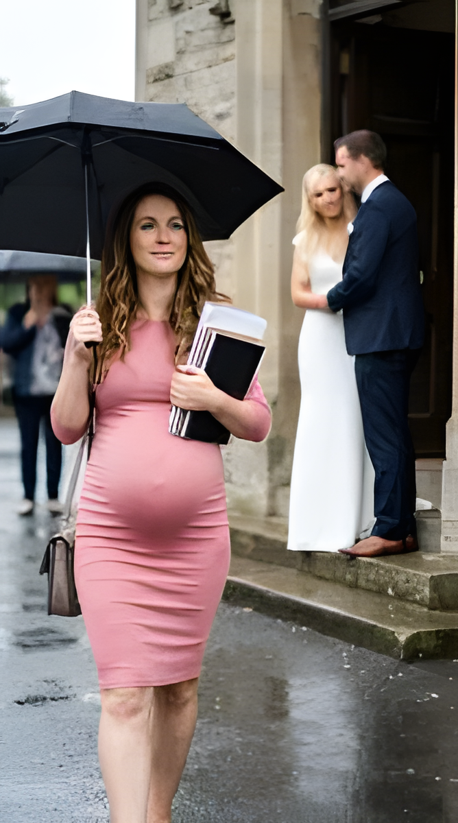 Madeline stepped out carefully, one hand supporting her belly, and replied, “Of course, we would not want to delay the most important day of your life.”