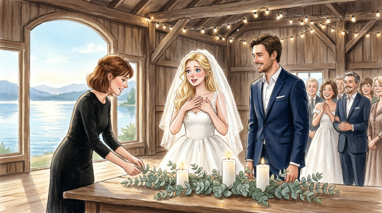 The room felt smaller after that. I found an empty chair near the window and sat down, watching the reflection of the lake shimmer behind the bridal chaos. Evelyn’s stylist was trying to tame a loose strand of hair that kept falling forward. Evelyn kept swatting at it impatiently, then apologizing, then apologizing again. Her hands would not stay still. She smoothed her veil, then adjusted it, then lifted it off altogether and set it aside.