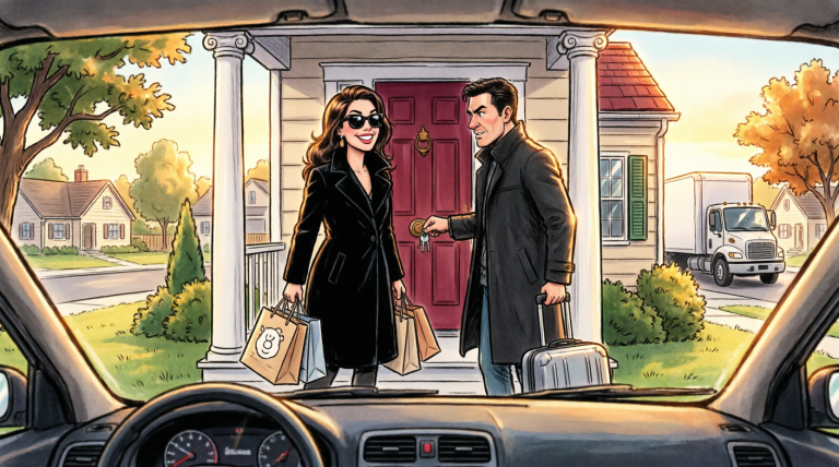 The key would not turn. My son Daniel stood on the front porch of my house, smiling from his long trip to Europe, one hand on a fancy suitcase and the other twisting the silver key again and again. His wife Melissa stood beside him in dark sunglasses, holding shopping bags and laughing like this was some small mistake. Then Daniel pushed harder. The key jammed. He frowned, pulled it out, and stared at the lock like the door had betrayed him. But the door had not betrayed him. I had. And as I watched from across the street inside a parked moving truck, one cold thought beat inside my chest. After everything I heard, after the words that broke my heart, how could I let them walk back into my life like nothing had happened?