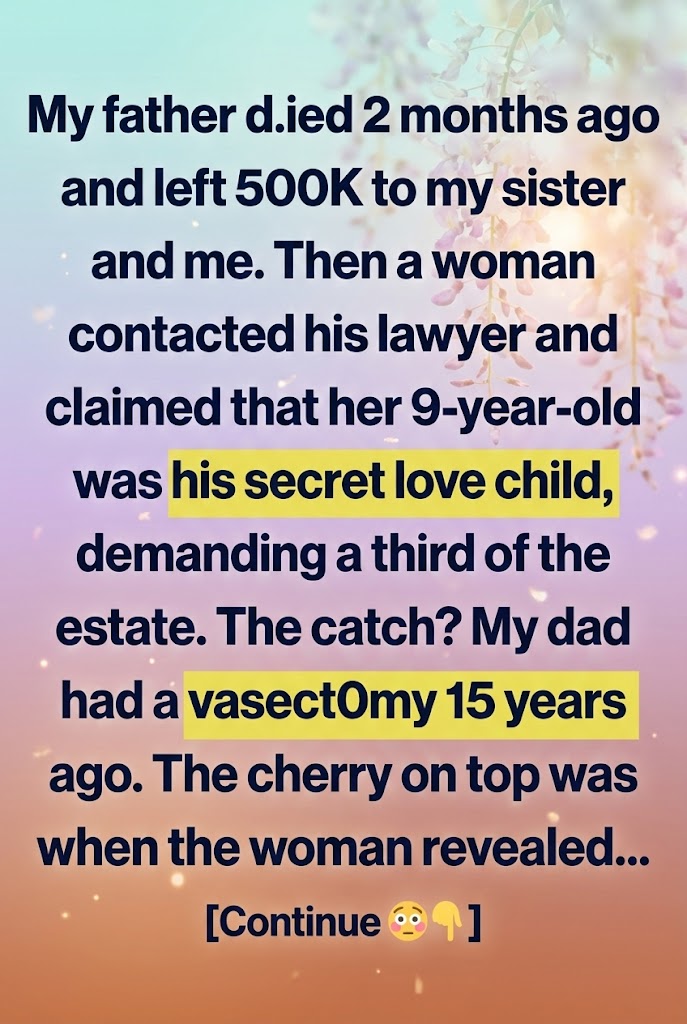 His lawyer called to tell us that a woman named Angela, 39, had reached out—claiming her nine-year-old son was my dad’s secret child and demanding a third of the estate. Just like that. My stomach didn’t just drop—it twisted. Not because I believed her, but because I knew exactly what kind of storm this was going to turn into.